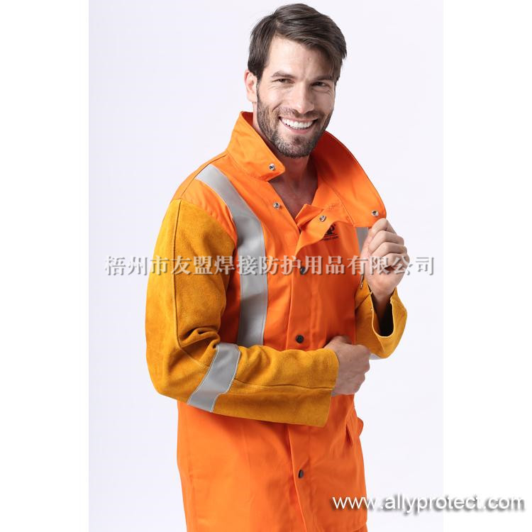 袖由抗火隔熱的牛二層皮制成,衣身由水洗防火阻燃布制成,安全舒涼;